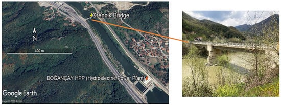 The real-time river monitoring station is installed on the Örencik Bridge, located at coordinates 40°35′2.33″ N 30°19′56.21″ E on the Lower Sakarya River. As shown in Figure 1, the Örencik Bridge, located downstream of the Doğançay HPP I (hydroelectric power plant), is strategically positioned upstream of central residential areas, industrial establishments, and factories. This location is crucial for gaining lead time in flood warnings and implementing preventive measures.