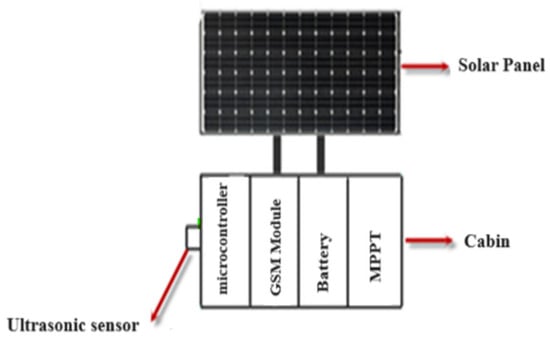 The energy requirements of the system have been carefully calculated. The ultrasonic sensor consumes 1.2 Wh per hour, while other components, including the microcontroller and a GSM module, consume 4 Wh per hour, resulting in a total system consumption of 5.2 Wh per hour. To ensure uninterrupted operation for one week, the system requires 873.6 Wh of energy (168 h × 5.2 Wh). The integrated 12 V, 72 Ah battery is sufficient to meet this demand, allowing the station to function reliably even under low sunlight conditions.