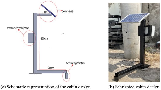 To securely mount the ultrasonic sensor, a custom-designed cradle was developed to ensure stable placement and protection against external interferences. The cradle design allows for easy removal, when necessary, while ensuring the measurement area remains unobstructed. Figure 3 illustrates the station’s schematic and fabricated designs, highlighting the optimized placement of the sensor and the solar panel orientation.