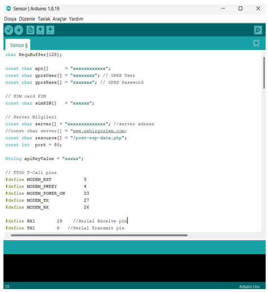 Through the coding within the program, communication is established with the SIM800 modem, and values read from the sensor are converted and transmitted to the server through the RS485 converter. In the coding, essential libraries, sensor values, server information, and other variable parameters are initially defined. As seen in the Arduino interface in Figure 5, these variables include APN settings, GPRS username and password, SIM card PIN code, and server address.