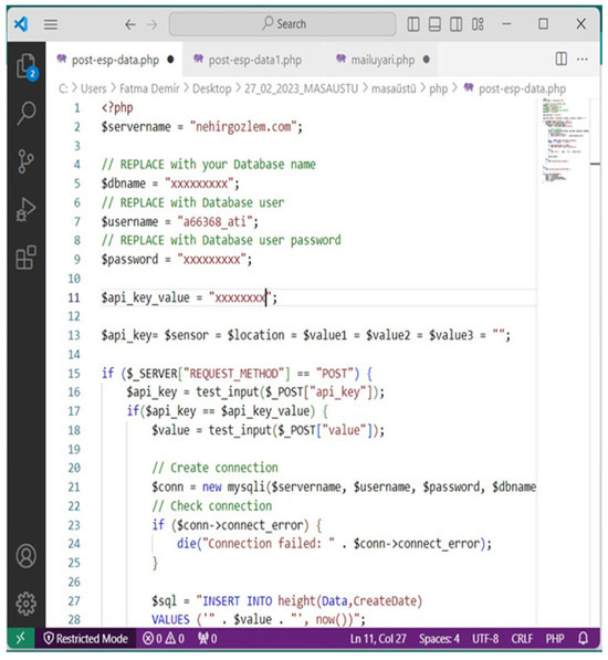 The values read from the sensor are processed via RS485 and displayed on the serial port. Then, a GPRS connection is established and sent to the server via HTTP POST request. This request is carried out by the server with PHP get functions (Figure 6). Additionally, when data transfer is successful, the device is put into deep sleep mode with ESP32 and energy is saved. The ESP32 remains in deep sleep mode for a defined duration (set to 1 s in the code), and it wakes up automatically when this time elapses, as managed by a programmed timer.