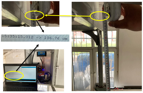The calibration study of the ultrasonic distance sensor conducted in the laboratory is shown in Figure 8. The figure illustrates the manual measurement of the distance between the sensor and the water surface using a measuring tape, which is then verified with the sensor readings. The manual measurement is recorded as 106.7 cm, corresponding to the 106.76 cm data automatically recorded by the ultrasonic sensor. Data from the sensor are monitored and recorded in real time on a computer screen, playing a critical role in verifying the sensor’s measurements and making necessary calibration adjustments. The consistency between manual measurements and sensor data confirms that the sensor is accurately calibrated and provides reliable data.