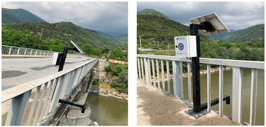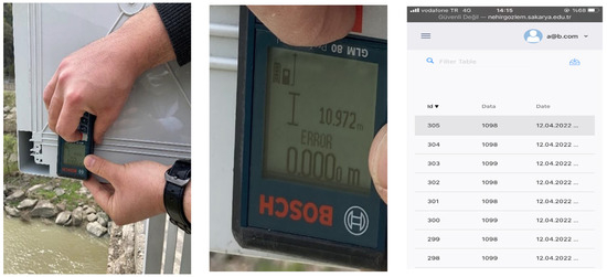 The real-time river monitoring station was integrated into a compact and waterproof cabinet (30 × 25 × 15 cm) to ensure the secure operation of components and resistance to environmental conditions. The necessary connections for the sensor and solar panel were optimized to guarantee reliable and uninterrupted functionality. The completed design was installed at the designated location, Örencik Bridge, after obtaining the necessary permissions from the Sakarya Metropolitan Municipality (Figure 10). After installation, sensor data were validated by comparing laser meter measurements with the values displayed on the web interface.
