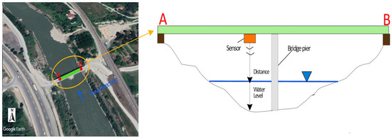 Real-time monitoring station installed on the Örencik Bridge measures the distance between the bridge deck and the water surface, facilitating the monitoring of water levels. Figure 12 presents a schematic representation showing the sensor’s placement on the bridge deck along with a Google Earth image of the bridge where the sensor is installed. This visual representation clearly displays the position of the sensor and its placement on the bridge. The calculation of the water level is performed by subtracting the distance from the bridge deck to the water surface from the total distance between the bridge deck and the riverbed.