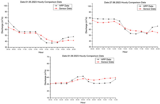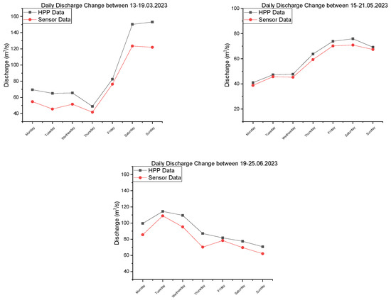 Figure 14 shows the comparison of daily average discharge values between HPP and the river monitoring station for the periods of 13–19 March 2023, 15–21 May 2023, and 19–25 June 2023. In the comparison for the period 13–19 March 2023, the weekly average discharge for HPP was 90.70 m3/s, while it was 73.65 m3/s for the observation station. The correlation coefficient between the two datasets was found to be r = 0.99, with a determination coefficient of 97.9%. This high level of agreement indicates the consistency and reliability of the measurements.