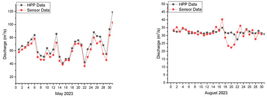 Figure 15 shows the comparison of daily average discharge values between HPP and the river monitoring station for May 2023 and August 2023. During May 2023, the daily average discharge for HPP ranged between 41.02 m3/s and 118.73 m3/s, while for the river monitoring station, it varied between 38.81 m3/s and 103.08 m3/s. The correlation coefficient between the two datasets was calculated as 0.92, indicating a high level of agreement. In August 2023, the daily average discharge for HPP was approximately 32 m3/s, while for the river monitoring station, it was approximately 31.5 m3/s. The correlation coefficient was calculated as 0.85, showing a strong linear relationship between the datasets. Notably, significant discrepancies were observed between 16–20 August, primarily due to water retention operations and sudden releases for electricity generation at the dam. The average absolute error during this period was approximately 1.5 m3/s, and the root mean square error was 2 m3/s. The strong agreement observed during both periods reinforces the accuracy of the river monitoring station’s measurements.