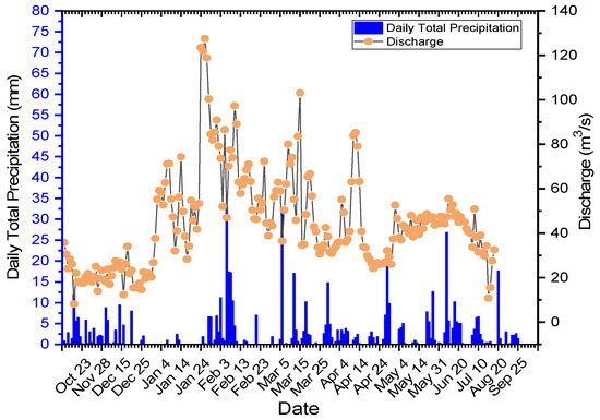 River Monitoring Station 2023 Hydrological Year Discharge Variation and Daily Total Precipitation.