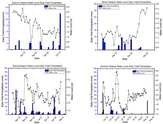 The water level measurements obtained from the real-time monitoring station were compared with the daily total precipitation, as shown in Figure 17. Increases in water level observed during periods of increased precipitation are significant indicators supporting the accuracy of these data.