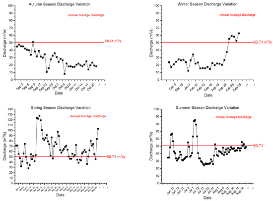 Figure 18 presents the seasonal variation in daily average discharges obtained from the real-time monitoring station between September 2022 and August 2023. The sharp peaks in seasonal variation are explained by the daily total precipitation changes. The annual average discharge value of the real-time monitoring station was calculated to be 50.71 m3/s and has been added to the graphs as a comparison axis.