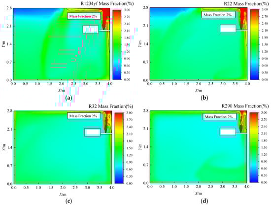Figure 8 illustrates the concentration distribution of different refrigerants on the yz (x = 2 m) plane 30 min after free diffusion following a leakage event. It can be seen from Figure 8 that after the leak stops, free diffusion of the refrigerants results in significant variations in their spatial distribution, with distinct deposition characteristics observed at the bottom of the space. Refrigerants with high densities, such as R1234yf, exhibit higher concentrations near the floor (1.69%) and lower concentrations at the top of the room (0.7%). For refrigerants with lower densities, this trend reverses: R22 (1.63% bottom, 0.77% top), R32 (1.44% bottom, 0.85% top), and R290 (1.32% bottom, 0.94% top). This behavior is attributed to the initial downward diffusion of denser-than-air refrigerants, leading to accumulation near the floor. Subsequently, the gravity, viscosity, and concentration gradients drive a downward flow towards the upper region. Due to their slower diffusion rates, the denser refrigerants exhibit a more pronounced deposition near the floor. Conversely, R717, being less dense than air, accumulates at the top of the room (5.24%) with significantly lower concentrations near the floor (0.16%). Furthermore, a comparison of R290 and R744, which have similar densities, highlights the influence of viscosity. R744, with its higher viscosity, exhibits a greater concentration at the bottom of the room (1.39%) compared to R290. This suggests that a higher viscosity can impede refrigerant diffusion, leading to increased deposition. These results underscore the significant impact of both density and viscosity on the distribution and deposition characteristics of different refrigerants following a leakage.