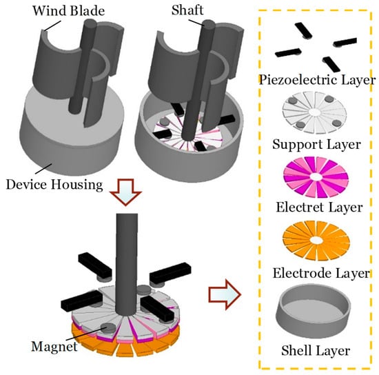 This paper presents a coaxial rotating non-contact coupling transducer structure based on the principles of electrostatic induction and magnetically actuated piezoelectric transduction. Although the absolute charge amount of the polar plates in the electret structure with alternating positive and negative polarities is reduced, it significantly enhances the charge variation amplitude and the charge difference between the electrodes. Consequently, the open-circuit voltage and short-circuit current of electret component are markedly increased. Additionally, the output electrical signal is less susceptible to interference, which is positively correlated with rotational speed and brief, making it more suitable than piezoelectric components for deriving rotational speed and wind speed information through inverse analysis. The magnetically actuated piezoelectric component, with an appropriately designed variable cross-section, exhibits a smaller stress distribution under load, resulting in a more stable structure. This design also changes the open-circuit voltage and natural frequency to optimize output performance and compensates for the low power density of the electrostatic components. The non-contact superposition coupling of multiple pairs of electret and piezoelectric transducers reliably enhances the absolute output of the device while providing complementary integration, broadening the operational frequency range, and optimizing performance at low rotational speeds. This design also extends the device’s lifespan. By integrating the output characteristics of each component, an energy management circuit is designed, and the device is tested. It operates reliably within a rotational speed range of 100–700 rpm, achieving a maximum overall output power of 6.74 mW. The output of the electret electrostatic component’s electrodes nearly doubled, while the output of the magnetically actuated piezoelectric component increased by up to 11.51% under certain conditions. Additionally, the signal from the electret electrostatic component exhibited a strong and brief positive correlation with rotation speed, validating the theoretical analysis. In summary, the non-contact coupled rotational energy-harvesting structure designed in this study can reduce device wear and operate over a wide range of wind speeds. The electret electrostatic component and the piezoelectric component complement each other, offering the potential for application in wind speed measurement. Additionally, by optimizing the arrangement and size, the output capability of the components is enhanced within the same space. This provides a new approach for the sustainable, reliable, and integrated design of wind-energy-harvesting devices.