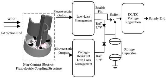 The outputs from the piezoelectric and electrostatic components are stored in energy storage elements via an energy management circuit and subsequently processed for external output. The topology structure of the system is illustrated in Figure 2.