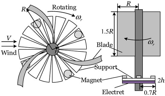 The blades are driven by a rotating shaft, causing the electret and the electret support layer to rotate. Due to resistance, the rotation speed of the blades is not equal to the wind speed, but there is a theoretically corresponding relationship in Equation (1):