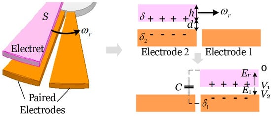 where d represents the distance between the electret and the plates, h is the thickness of the electret, and are the dielectric constants of the electret and air, respectively, S is the area of the electret directly opposite the plates, and C represents its equivalent capacitance. The induced charge density on plate 1 can be concluded as Equation (3):