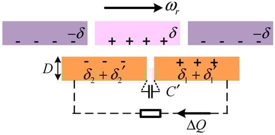 The induced charge on the electrode plate is simultaneously influenced by the electret with surface charge densities of and . Continuing to analyze the right electrode plate 1, the induced charge generated by the negatively polarized electret directly opposite the area of is denoted as . Then, Equation (4) could be modified as following Equation (5) for the optimized model, based on the same assumptions:
