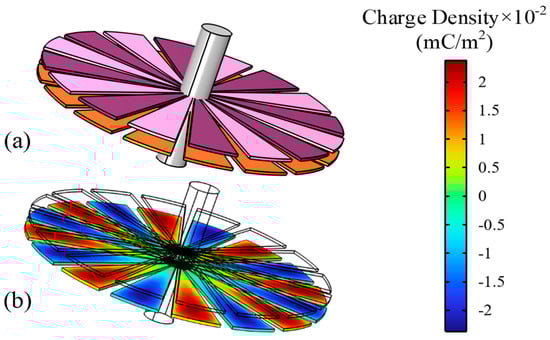 As the rotational speed increases, the amplitude of the short-circuit current theoretically grows linearly, while the amplitude of the open-circuit voltage remains unchanged. A finite element simulation of a steady-state electrostatic induction distribution model is constructed to calculate the output performance of the alternating positive and negative polarity electret-optimized transducer component, based on theoretical models and assumptions. Then, use the finite element simulation software COMSOL v.6.2 for modeling. Establish the boundary conditions by applying surface charge density of 0.05 mC/m2 to the lower surface of the electret, while the charge and potential on the upper surface are set to zero. The surface charge distribution on the copper electrode plates is illustrated in Figure 7.