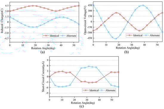 The simulation results indicate that when the distance between the electrode and the electret is sufficiently small, the induced charge on the electrode surface is dominated by the nearest electret film. Although the interleaved polarities of the electret structure lead to certain degree of reduction in the absolute charge amount on the copper electrode plates due to the partial cancelation of the opposing electric fields, this configuration can significantly enhance the variation in the induced charge on the electrode and the charge difference between paired electrode. As a result, the open-circuit voltage and short-circuit current of the component are improved. With a rotational speed set at 60 rad/s, the short-circuit current output of the component during the rotation of the electret layer is derived from Equation (6). The simulation results align closely with theoretical expectations, and electret transducer component exhibits characteristics of high open-circuit voltage, low-output current, and high dynamic equivalent resistance. And all the simulation results converge successfully, achieving the tolerance requirement of 1 × 10−6after nine iterations.
