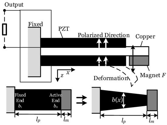 Compared to resonant systems that operate at their characteristic frequency, magnetically actuated systems operate over a much wider frequency range but with lower output. To increase the output power of the magnetically actuated piezoelectric component, in addition to the most basic way that increase the number of permanent magnets to trigger the oscillation decay process based on natural frequency more frequently, changing the structure and dimensions of the piezoelectric cantilever beam is also a method. Studies [24,25] show that replacing the rectangular cantilever beam with a variable cross-section cantilever beam structure will cause changes in the natural frequency of the piezoelectric cantilever beam, the surface area of the piezoelectric layer, and the stress or charge distribution on surface, thereby affecting the output of the piezoelectric cantilever beam. Thus, increasing the output of the magnetically actuated piezoelectric component based on the optimization method of non-uniform cross-section cantilever beams is chosen. The coupled structure uses four sets of piezoelectric double-layer cantilever beams in parallel, with a single component structure used for calculation and analysis shown in Figure 9.