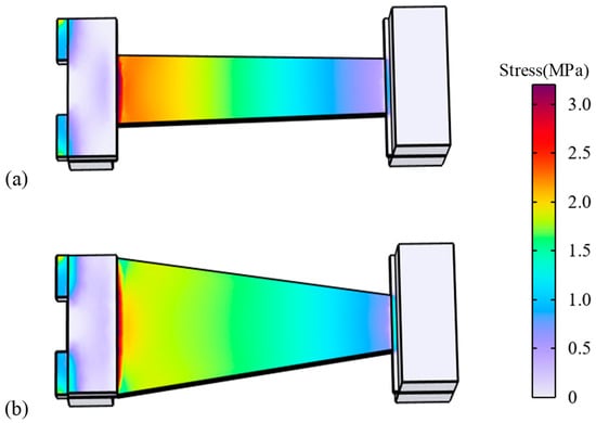 Simulation model of variable cross-section piezoelectric cantilever beam and axial stress along the length direction: (a) constant cross-section cantilever beam and (b) non-uniform cross-section cantilever beam.