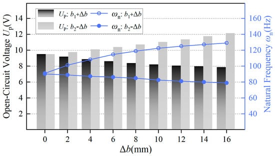 Taking the process of increasing the fixed end in Figure 11 as an example, under the condition that the applied force F remains constant, the piezoelectric cantilever beam undergoes linear elastic small deformations. Then, according to the analysis using Equations (8)–(10), the reduction in stress and strain distribution is offset by the increase in the surface area of the piezoelectric layer, resulting in nearly unchanged total surface charge on the piezoelectric component’s surface. Meanwhile, the increased surface area of the piezoelectric layer leads to an increase in the equivalent capacitance between the upper and lower surfaces, causing a decrease in the open-circuit voltage. Consistent with the theoretical model, this does not imply that strain changes the equivalent capacitance, but rather that widening b1 increases the equivalent capacitance. Regarding the natural frequency, the process of increasing b1 gradually increases the structural stiffness, which in turn leads to an increase in the characteristic frequency. As mentioned earlier, increasing the natural frequency will accordingly enhance the output current. During the process of increasing the piezoelectric cantilever beam b1, the voltage decreases, while the current correspondingly increases, allowing for the existence of suitable dimensions that can enhance the output power. It could be achieved by testing the output power through experiments; thus, the optimization of piezoelectric components is also achieved. Furthermore, the process of decreasing the active end b2 can be explained in the same manner.