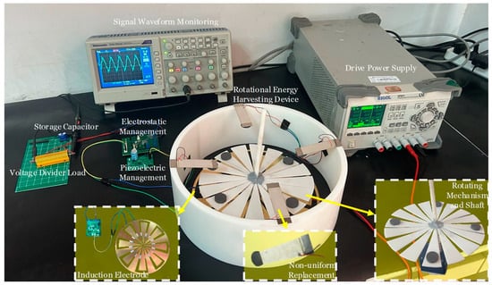 The experiment employed the unipolar electret with charges only on the upper sur-face. To perform the comparative experiment, the piezoelectric components can be replaced with both uniform and non-uniform cross-section cantilever beams, the electrostatic components can also be substituted with alternating polarities and only positive polarity electret. To protect the piezoelectric components, permanent magnets adhered to the white electret support utilize ferrite with an adhesion force approximately 1/8 that of strong neodymium–iron–boron magnets, rather than using the latter. The chemically inert insulated support forms a reliable and stable support for the electret, working together with the copper electrode plates to constitute the electrostatic component. And in the experimental platform, the drive power supply is used to drive a variable-speed rotating motor, replacing the original wind blades drive of the structural design. This facilitates more precise control of the rotor speed for testing the electrical output performance and optimization effects of the device. The speed range of the motor is selected based on the characteristic of the device being driven by wind power for rotation, with the testing range of 100 to 700 rpm.