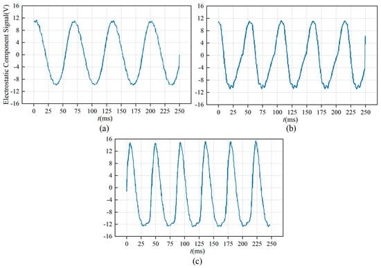 The alternating polarities electret electrostatic component outputs signals in pairs of plates during operation, exhibiting a positive correlation with rotational speed (a) rotating at 100 rpm, (b) at 175 rpm, and (c) at 250 rpm.