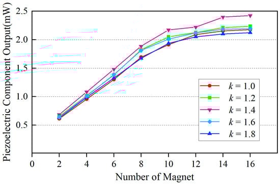 Subsequently, test the output power of piezoelectric components with varying bottom base widths to achieve optimization of the dimension and structural design. In alignment with the analytical methods discussed in Section 3.2, define the size parameter k as the ratio of the fixed end b1 to the active end b2 for different piezoelectric components. Due to the slender design of the piezoelectric cantilever beam in the theoretical model, further reducing the dimensions at the active end significantly impacts its load-bearing capacity and structural stability, making it susceptible to damage during actual operation. Therefore, the experimental model employs an approach that increases the fixed end b1. Additionally, the effect of symmetrically distributing permanent magnets on the output is also evaluated. Optimization results of piezoelectric components at a relatively stable rotational speed of 250 rpm are illustrated in Figure 14.