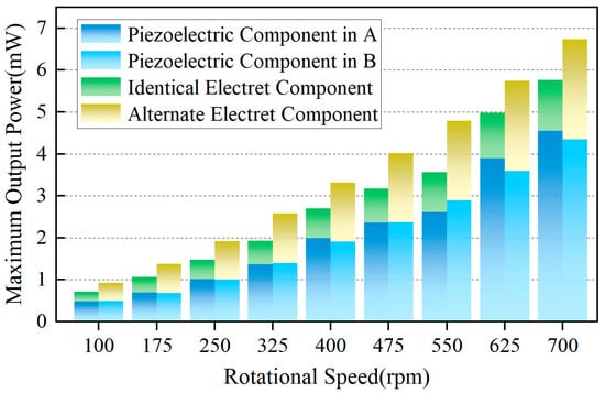 The maximum power output test results of the electret–piezoelectric coupling energy-harvesting structure, based on alternating positive and negative polarities and optimized non-uniform cross-section piezoelectric cantilever beams at different rotational speeds, are shown in Figure 15.