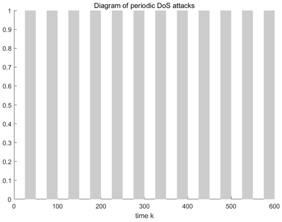 Figure 3 illustrates the periodic DoS attacks on the multi-agent system. The gray areas represent the active periods of the periodic DoS attacks, while the remaining areas represent the dormant periods. During the dormant periods of DoS attacks, the data transmission success rate between agents is set to 0.9, while during the active periods, the success rate is reduced to 0.7.