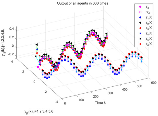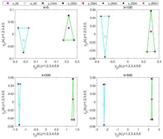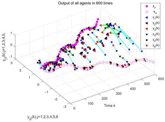 This experiment verifies the effectiveness of the proposed DET-MFAILC scheme for controlling the formation of BFMASs with time-varying topologies. In the experiment, all initialization parameters are the same as those for the BFMASs with a fixed topology. The difference lies in that the communication topology of the BFMASs in this experiment is time-varying, as shown in