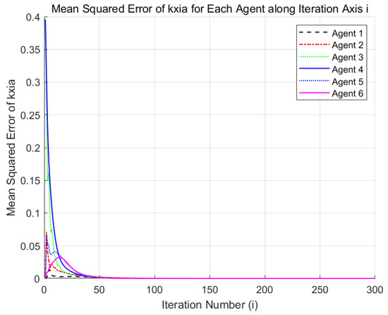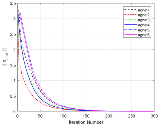 Figure 17, all agents are able to effectively track the leader’s trajectory with good consensus. The tracking errors of the agents converge close to zero after 250 iterations, as shown in