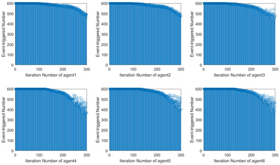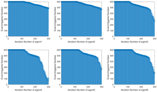 22], it is evident that the number of event triggers during system operation decreases along the iteration axis but exhibits instability with fluctuations. In contrast, when using the DET condition proposed in this paper, the number of event triggers during system operation stabilizes and decreases significantly after 120 iterations. This shows how the event-triggered condition designed in this paper can more efficiently save network resources by reducing the amount of controller updates.