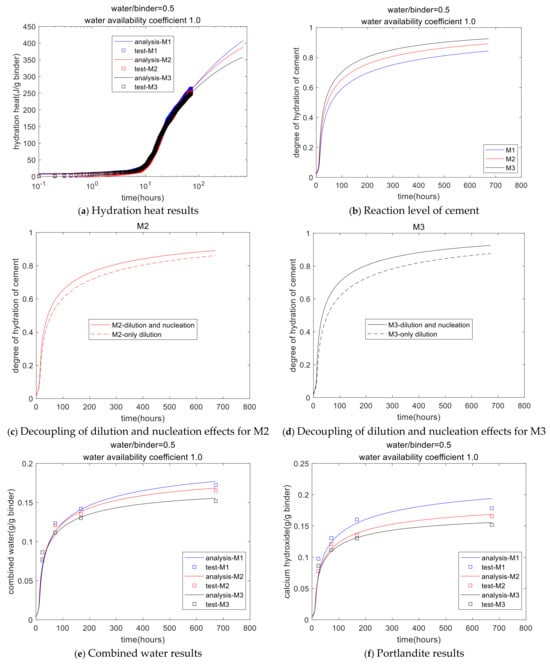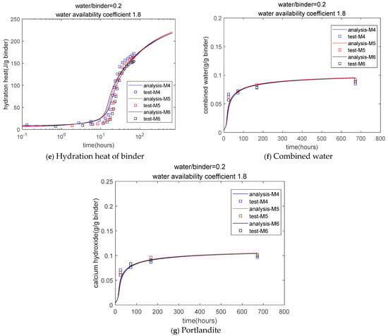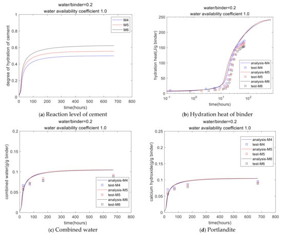 Effect of cement mineralogical composition: In the different types of Portland cement, the mineral compositions are similar; they are all C3S, C2S, C3A, and C4AF, but the corresponding mass percentages of these minerals are different. Early-strength cement contains more C3S and C3A, and low-heat cement contains more C2S. In a multi-component hydration model, it is assumed that the individual mineral components of the cement, C3S, C2S, C3A, and C4AF, hydrate independently. Based on the experimental results of the degree of hydration of each mineral, the reaction rate parameters B, C, De0, and Kr corresponding to each mineral component, C3S, C2S, C3A, and C4AF, can be calibrated separately. In our previous work [], the multi-component hydration model was used to consider the effect of cement mineralogical composition.
