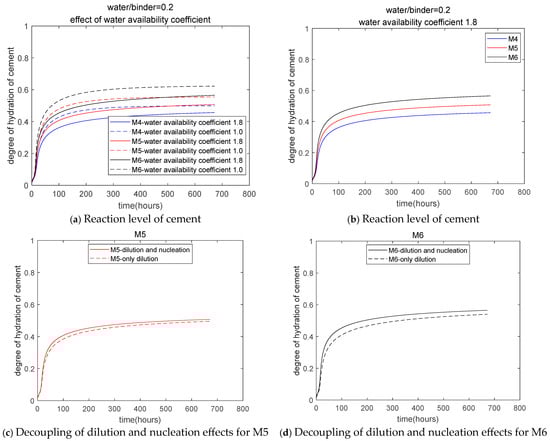 Figure 3 illustrates the impact of different water availability coefficients on the reaction level. As the water availability coefficient increases from 1.0 to 1.8, the calculated results for the cement reaction level decrease significantly (Figure 3a). The reaction level of the cement also increases as the chemically inert quartz filler substitution amount rises (Figure 3b). Figure 3c,d show the separation of the dilution and nucleation effects: the solid line represents both effects, the dotted line shows only the dilution effect, and the difference between the two lines indicates the nucleation effect. For concrete with a water-to-(cement + quartz) ratio of 0.2, the solid and dashed lines are relatively close, suggesting that the nucleation effect is minimal. In this case, the chemically inert quartz filler primarily acts as a diluting agent. When the water availability coefficient is set to 1.8, the calculated results for the hydration heat more closely match the tested values (Figure 3e). The calculated values for the chemically combined water and portlandite are also more consistent with the experimental data (Figure 3f,g). For concrete with a low water-to-(cement + quartz) ratio of 0.2, the changes in the amounts of chemically combined water and portlandite are minimal when the substitution rate of the chemically inert quartz filler varies from 10% to 20%. Our simulation results successfully reproduce this experimental observation. Additionally, on day one, the tested values are slightly higher than the calculated results. This discrepancy may be because our simulation did not consider the delaying effect of the superplasticizer on the cement hydration reaction [].