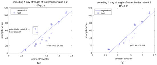Here, fc represents the compressive strength, and A1 and A2 are strength coefficients. Figure 4a illustrates the relationship between strength and . For different mix ratios and ages, the overall compressive strength is a linear function of , with a coefficient of determination for the linear regression of 0.77. However, for the specimen with a water-to-(cement + quartz) ratio of 0.2, the one-day strength deviates from the regression curve. When we excluded the one-day strength data for the specimen with a water-to-(cement + quartz) ratio of 0.2 and performed the linear regression again, the coefficient of determination increased to 0.91, which is significantly higher than that shown in Figure 4a.