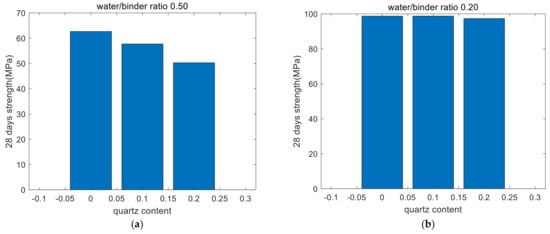 Twenty-eight-day strength of paste with water/binder ratios 0.5 and 0.2. (a) Twenty-eight-day strength of paste with water/(cement + quartz) ratio 0.5. (b) Twenty-eight-day strength of paste with water/(cement + quartz) ratio 0.2.