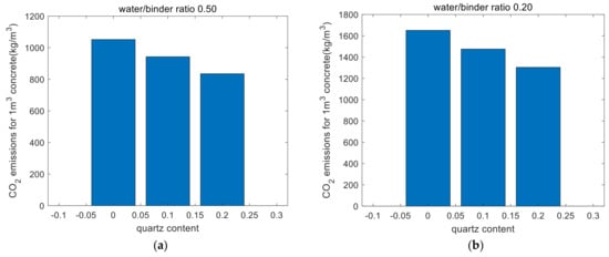 CO2 Emission Analysis: The CO2 emission analysis revealed that for concrete with a water/binder ratio of 0.5, the CO2 emissions per unit strength remained relatively unchanged as the quartz powder content increased. However, for concrete with a water/binder ratio of 0.2, the CO2 emissions per unit strength decreased significantly with the higher quartz powder content. This is because the dilution effect of quartz powder enhances both hydration and strength at a lower water/binder ratio, leading to lower CO2 emissions per unit strength.