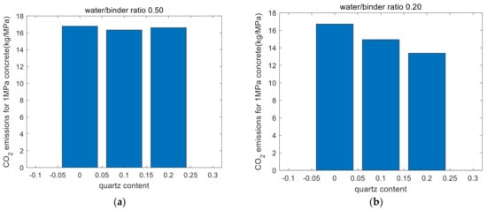 Figure 7a shows that for concrete with a water/binder ratio of 0.50, the CO2 emissions per unit strength do not change significantly with the increase in the quartz powder replacement. In contrast, Figure 7b demonstrates that for concrete with a water/binder ratio of 0.20, the CO2 emissions per unit strength decrease significantly as the amount of quartz powder replacement increases. When the water/binder ratio is 0.2, the reductions in CO2 emissions per unit strength are 11% and 20% with the 10% and 20% quartz powder replacement rates, respectively, compared with the specimen without quartz powder. This is primarily because the dilution effect of quartz powder enhances the degree of hydration (as shown in Figure 3b) and strength (Figure 5b), thereby lowering the CO2 emissions per unit strength.