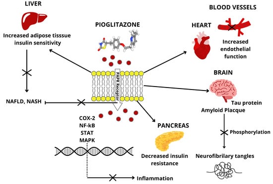 Pharmacological effect of pioglitazone on the cardiovascular and nervous system, as well as hepatic and metabolic function. Effect of pioglitazone on different systems. Pioglitazone enhances insulin sensitivity, which improves endothelial, neuronal, pancreatic and liver cell function (created using https://biorender.com, URL accessed on 25 January 2025).