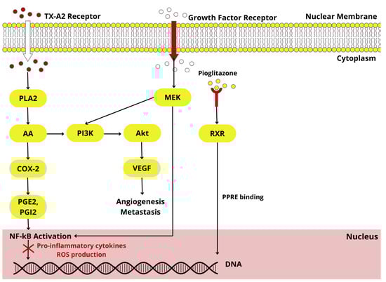 Pharmacological effect of pioglitazone facilitated through the inhibition of thromboxane A2 (TX-A2) and growth factor receptor pathways. The former regulates the expression of phospholipase A2 (PLA2), arachidonic acid (AA), cyclooxygenase-2 (COX-2), prostaglandin E2 (PGE2) and prostacyclin I2 (PGI2). The latter regulates the expression of vascular endothelial growth factor (VEGF) through the phosphoinositide 3-Kinase pathway (PI3K) (created using https://biorender.com, URL accessed on 25 January 2025).