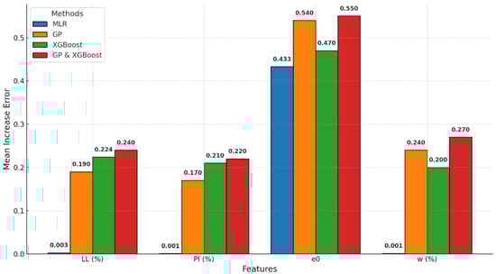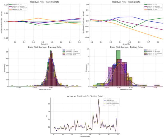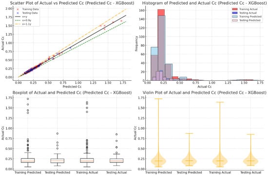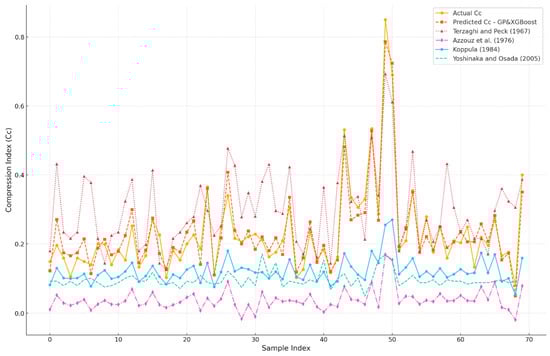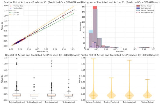 Combining GP and XGBoost into a hybrid model addresses the limitations of each standalone approach. This hybridization leverages GP’s adaptability and XGBoost’s computational power, leading to improved accuracy and reliability in predicting complex parameters like soil strength and stability under varying conditions [,,]. Recent studies have shown that hybrid models significantly enhance performance and can accommodate the variability seen across different soil types and conditions, making them highly adaptable solutions for predicting Cc [].