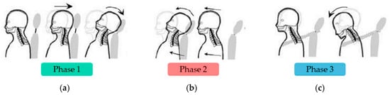 Road accidents represent a major source of injuries, with neck trauma occupying a significant place. Even at low speeds, these incidents can have devastating consequences on the health and well-being of the individuals involved [1]. When a vehicle is rear-ended, the passengers’ necks undergo a series of abrupt movements, putting strain on the delicate structures of this anatomical region [2]. These movements form what is called neck S-shape motion, consisting of three phases, retraction, forward movement, and belt restraint, as modeled in Figure 1. They can lead to injuries ranging from cervical sprains to vertebral fractures, with potentially serious consequences for the mobility and quality of life of the victims.