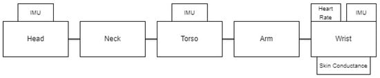 In the first mode of test, the volunteer’s left forearm was sensorized by the wristband that was equipped with a heart rate sensor (MAX30102) and a skin conductance sensor (Grove GSR) as in the scheme of Figure 4. The Arduino Nano was connected to an added TCA9548A multiplexer and MPU6050 IMU sensor [23].