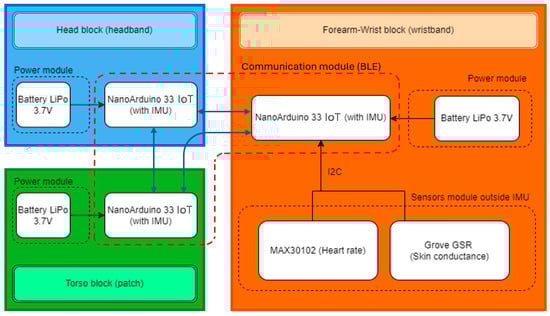A monitoring system is proposed in this paper that consists of three wearable device supports, namely a wristband, a headband, and a torso patch, as indicated in Figure 2. The wristband on the wrist serves as the central hub, containing several sensors, while the headband and torso patch house mainly IMU sensors. The used IMU sensors are IMU MPU6050 (2.5 × 3 × 0.83 mm, +16 g range) [23], integrated in Arduino 33 IoT [24], the heart rate sensor Analog MAX30102 (5.6 × 3.3 × 1.55, 1000 pulse/s range) [25], and the galvanic skin Grove GSR sensor (20 × 20 mm and 2000 mS range) [26]. The wristband houses a heart rate sensor and a skin response GSR sensor that can be used to monitor physiological signals indicating stress and aggressiveness. The wristband is provided with an IMU to monitor the arm motion at the level of the wrist. The torso unit uses an IMU to monitor the motion of the torso; likewise, the head unit is equipped with another IMU. Each unit is provided with an Arduino 33 IoT (45 × 18 × 2 mm) [18] for data acquisition and handling.
