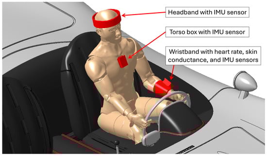 Location of the sensor units on a car driver: wristband with monitor heart rate sensor, skin conductance sensor, and IMU sensor; torso box with IMU sensor; and headband with IMU sensor.