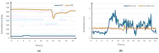 The data acquisition focuses on evaluating the system’s ability to accurately capture and process physiological data, particularly in detecting aggressive driving behaviors using data coming from the wristband, torso, and headband units. Several tests were carried out to ensure the sensors’ accuracy, synchronization, and reliability. In particular, the test experiences gave the following results.