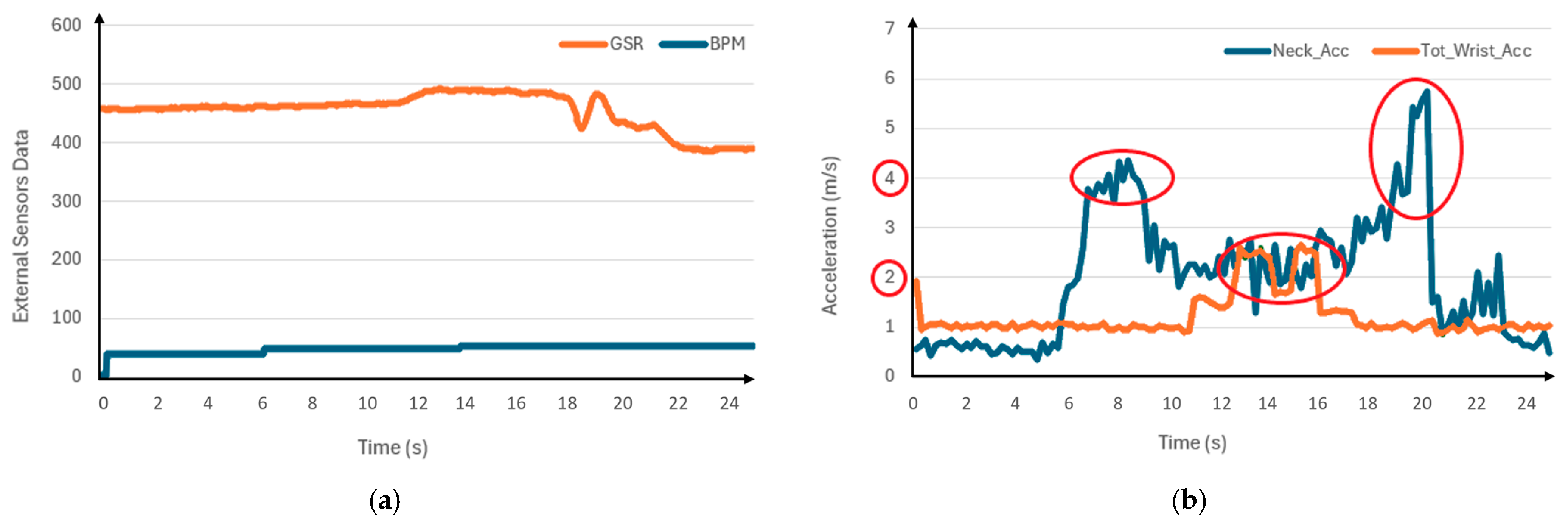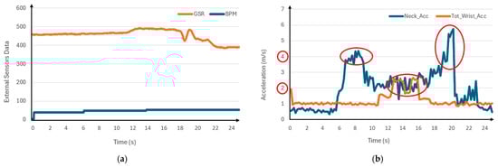 Referring to the aggressive driving in the second test mode, the results are shown in Figure 7, indicating that several acquired data points exceed the threshold values. The results in Figure 7a for heart rate (in pulse/s) and skin conductance (in mS) do not show significant variation and have low values, possibly due to failure in the sensors’ acquisition or driver acclimatization to aggressive driving. However, both neck and wrist acceleration in Figure 7b surpassed their thresholds, as the red circle highlights, meeting the criterion evaluation for aggressive driving.