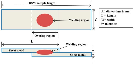 The materials selected for the experiments were commercially pure titanium Ti grade 2 and austenitic stainless steel 304 with thicknesses of 0.5 and 1 mm. These sheet materials were used to manufacture similar and dissimilar resistance spot welded joints with equal and unequal sheet thicknesses according to the lap-joint assembly using the AWS standard [] as shown in Table 1. Figure 1 shows the lap-joint assembly of the RSW specimens.
