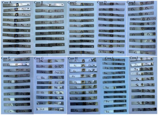 The distribution of RSW specimens is as follows: The 30-sample titanium sheet welding experiment, based on optimal findings reported in [], the 10-sample sheet welding experiment with an equal thickness of 1 mm, the 10-sample sheet welding experiment with an equal thickness of 0.5 mm, and the 10-sample sheet welding experiment with unequal sheet thicknesses of 0.5 and 1 mm are all included in this distribution. Similarly, 30 samples of AISI 304 sheets with thicknesses of 0.5 and 1 mm were welded according to the ideal parameters found in [] and labelled with D, G, and H. The ideal results in [,] were used to make the dissimilar RSW samples between AISI 304 and Ti grade 2 alloy. A total of 40 samples were used, with each case including 10 specimens and labelled E, F, I, or J. A simplified diagram of the experimental welding setup is shown in Figure 2. Figure 3 shows the fatigue-RSW samples of the ten cases. The RSW conditions of the ten cases (A–J) are shown in Table 4.