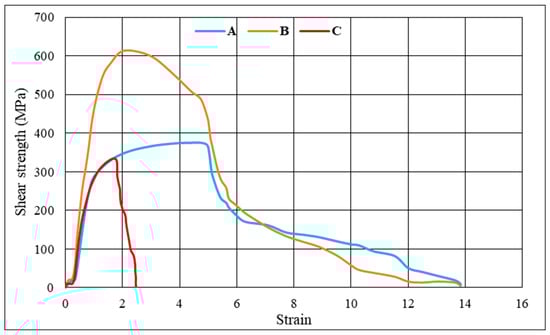 Shear strength of RSW specimens of titanium alloy cases: A (1–1 mm), B (0.5–0.5 mm), and C (1–0.5 mm).